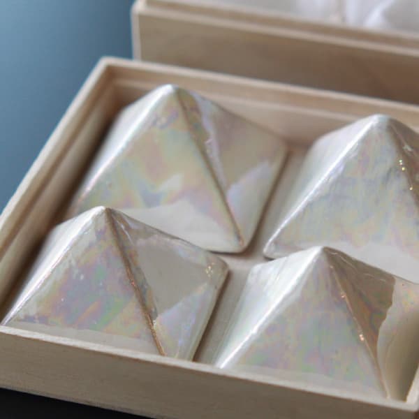 黒と緑(織部)を交互にまたは黒二つと緑二つづつを並べて配置することで4つのピラミッドに囲まれた空間で、内面的次元に向かうエネルギー(黒)と外の世界、空間へ向かうエネルギー(緑)を統合して結界のフィールドを生み出す置物です。ソマチット入りピラミッドの基礎となったオリジナルバージョンです。基本的には緑黒を交互に並べて使用しますが並べ方を変えることで状況に合わせた使い方が可能になります。例えばリラックスしたい場合は頭の近くに黒二つ並べ、足元に緑二つを配置する、距離を離したり近づけたりするなどの使い方による違いをお試しいただけます。音空間を調整するアイテムとしてもご活用いただいており、置くだけでステレオの音が大きくなった、迫力が出る、コンサートホールに置いて響きを良くなるなどの高い評価を頂いています。