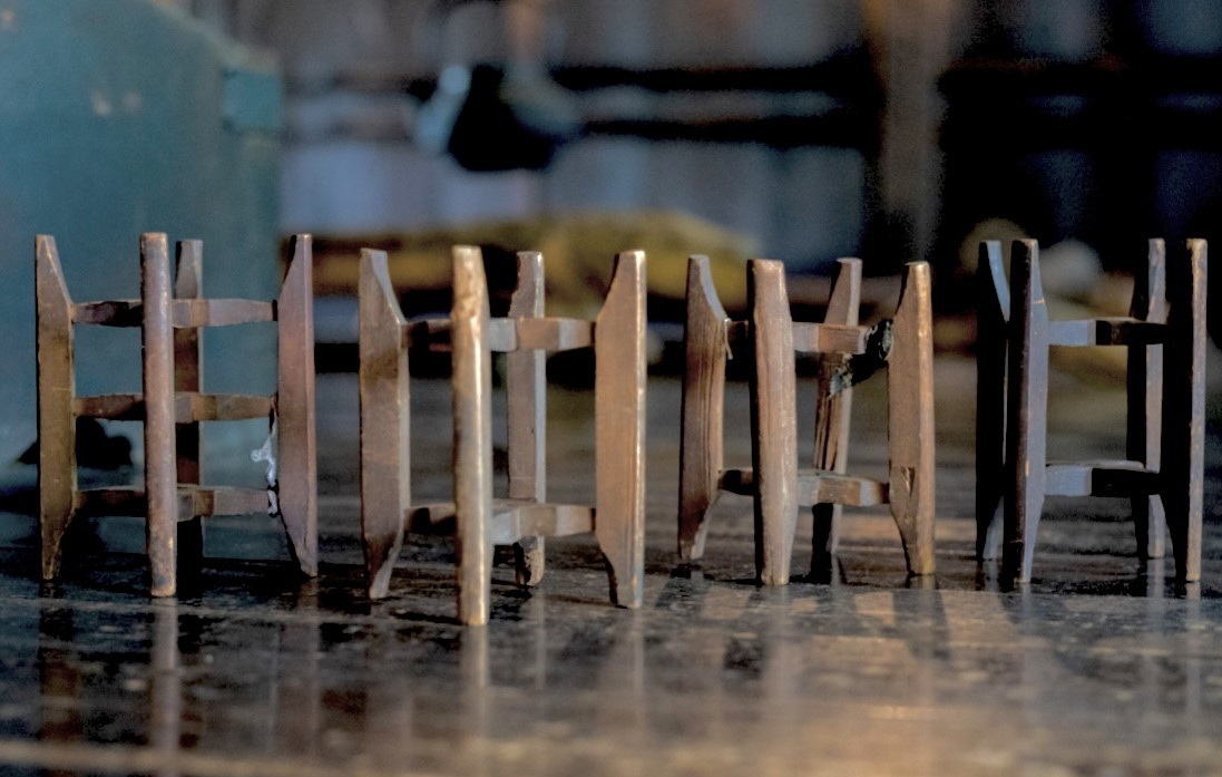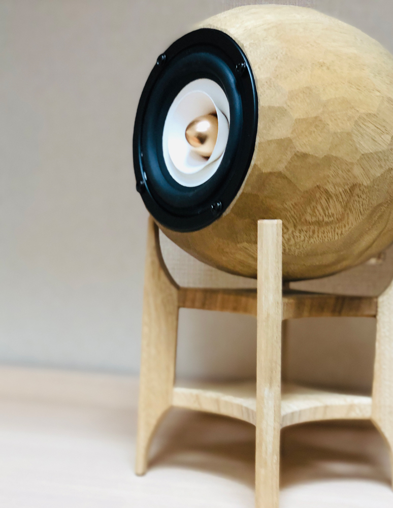 たまたま彫刻家の家で古い糸巻きを見つけ、スピーカーの試作品と組み合わせてみたところ、非常に良い音響特性を持っていることがわかったので、オーダーメイド・スピーカーのスピーカー・スタンドとして改修することにし始めました。特に卵型のスピーカーと組み合わせた場合、糸巻きの先端が尖っているため、理想的な接点を持つインシュレーターとなり、無垢材同士が接触することで自然に共鳴し、不快な響きの乱れのない振動を伝えるスピーカースタンドとしての良い効果を生み出します。不用品として捨てられてしまう道具に新たな生命を吹き込む試みとして継続しています。