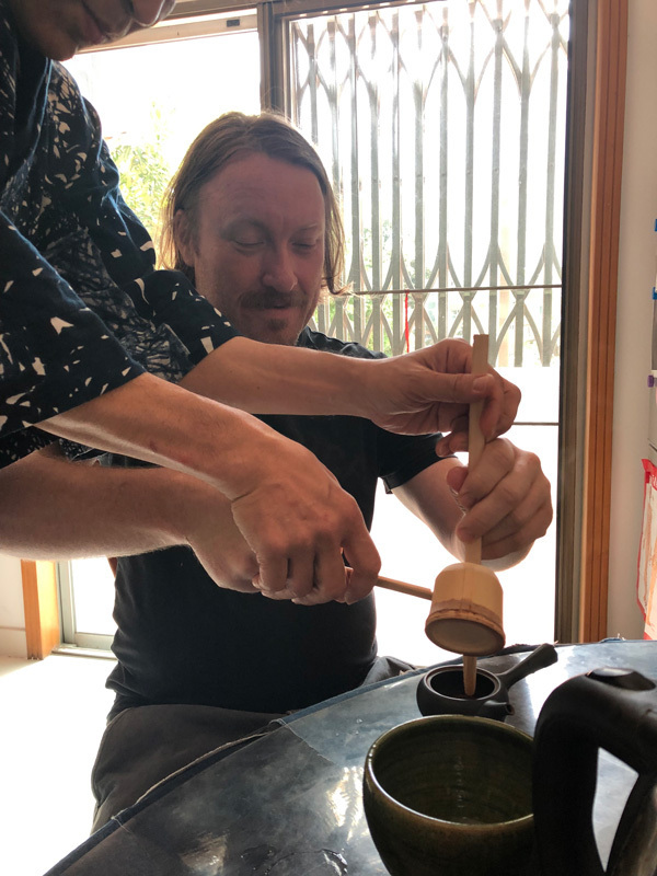お湯の汲み方:釜があれば理想的ですがポットのお湯を器に移して柄杓で三分の一程度以下に汲んで下さい。お湯を柄杓に入れすぎると後の動作がやりにくくなります。