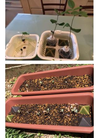 サウンドウォーターで生成した陶器による植物の発芽実験。丹波の黒豆が水耕栽培で発芽成功
