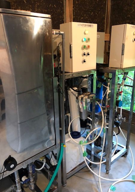 比較実験するにあたっては基本となる水の状態を同じにする必要がある事から特注オールステンレス製の水製造装置を導入、設置して逆浸透膜方式の還元水を生成した上でミネラル成分などを定常化し、サウンドウォーターの原水として使用しています。ファミリーラボの製品にはサウンドウォーターの技術が随所に応用されています。
